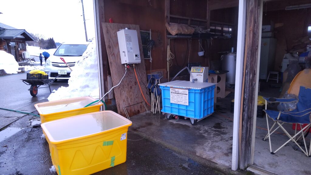 黄色いタンクは冷却用のプールです、お湯から出したら素早く冷却します。