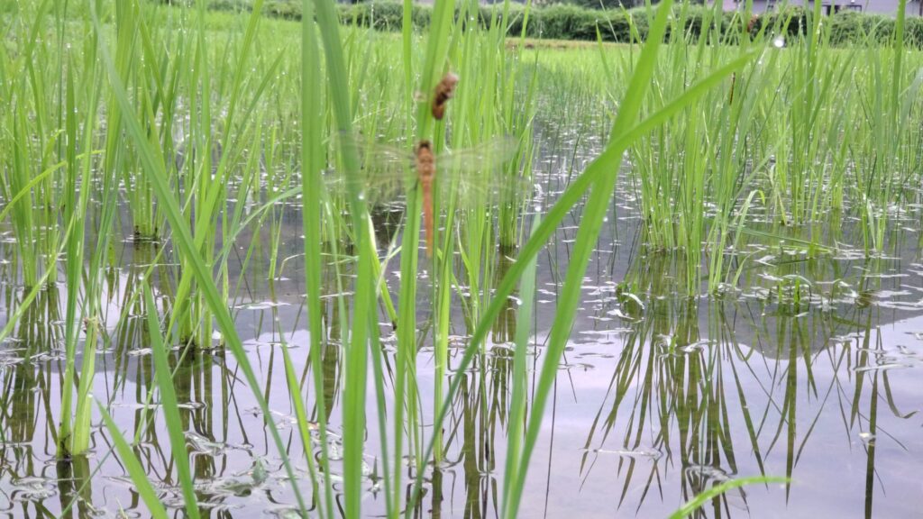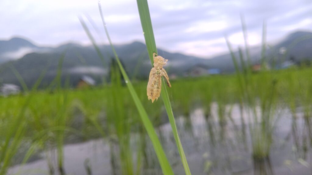 米作り 今年もアキアカネ羽化の時期がやってきました! 2023-07-09 motosuke 稲は分げつ成長が本格的に始まりました、水生動物のヤゴが羽化して田んぼから旅立ちます。数か月後には戻り田んぼなどに卵を産み命をつなぎます。
